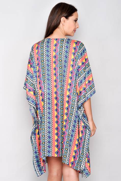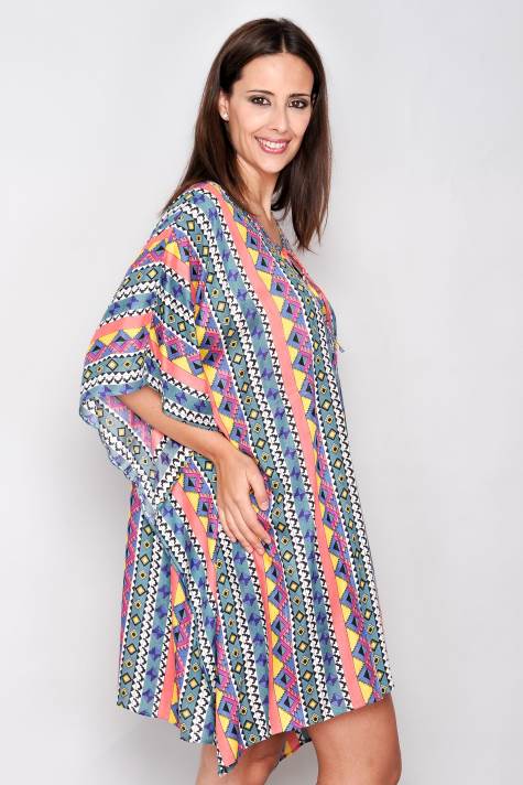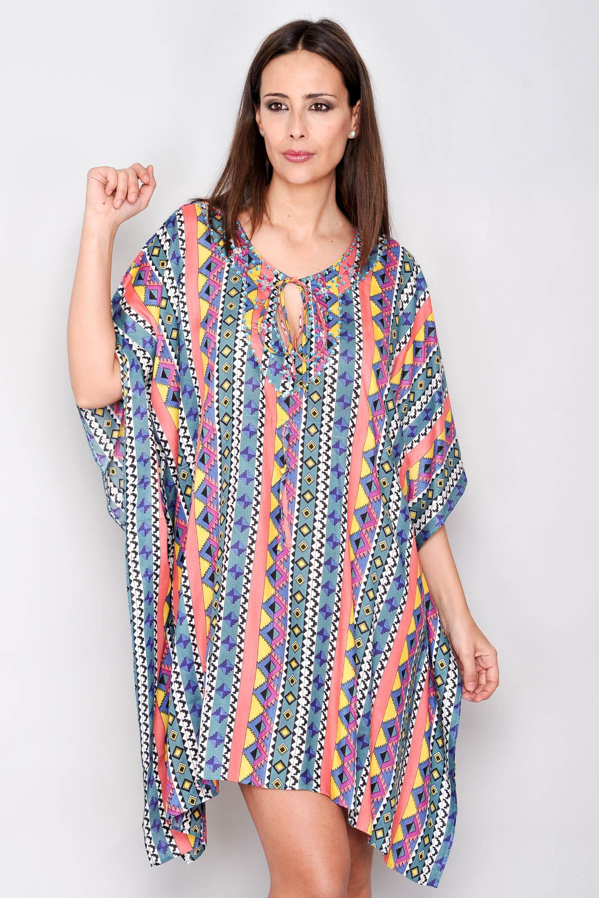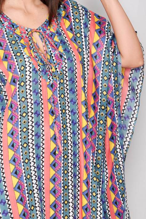 Kaftan playeroCuello en pico con cintasAdornos azules, blancos y rosasCintura ajustable