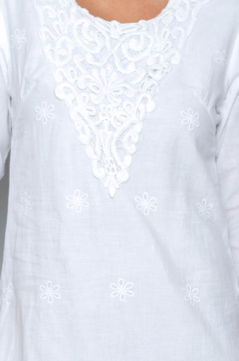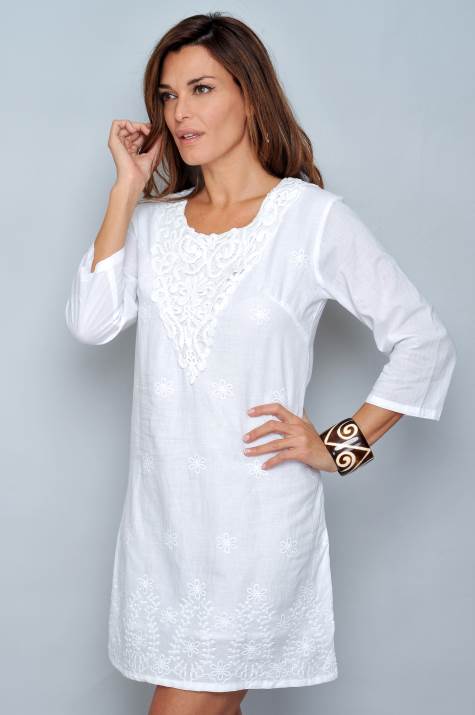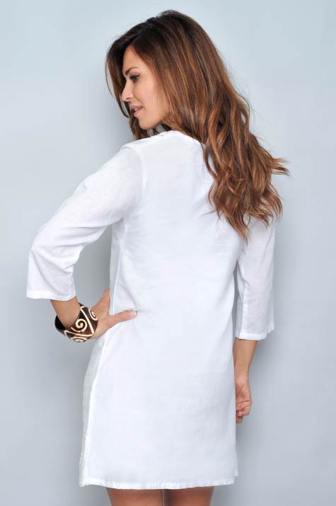 Vestido con forroManga largaDetalles de bordados en blancoGreca en bajo