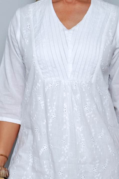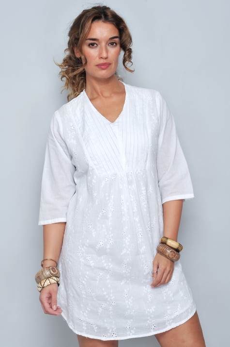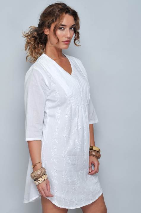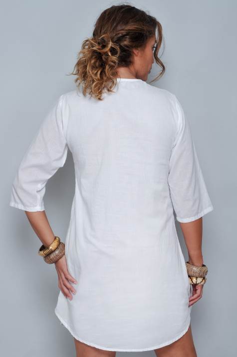 Vestido con forroManga largaDetalles de bordados en blancoTablas en el pecho