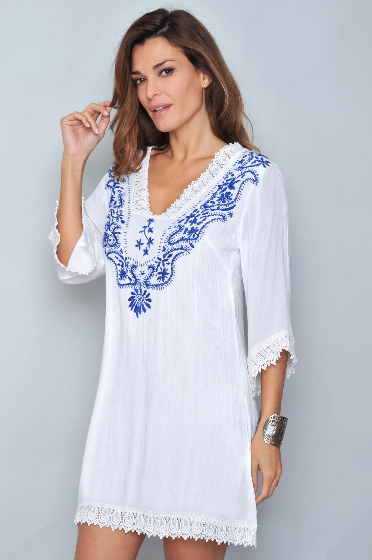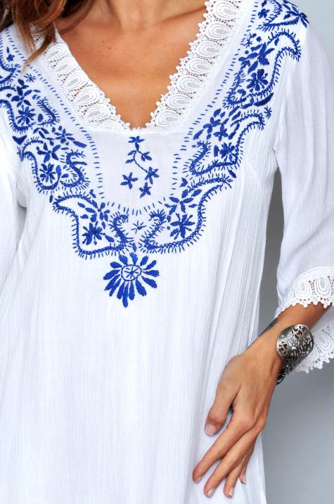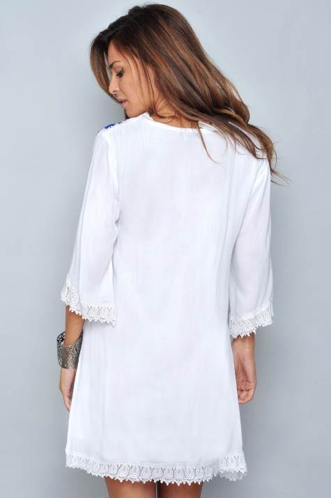 Vestido blancoCon forroManga larga Cuello en picoBordados en pecho de detalles en azulPuntilla en cuello, puños y bajo