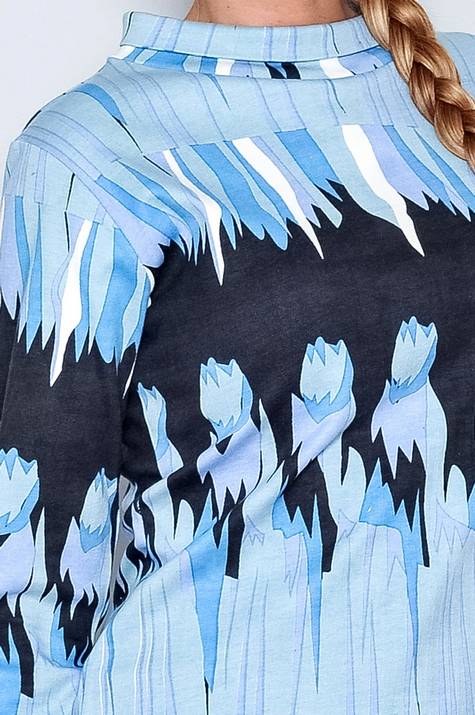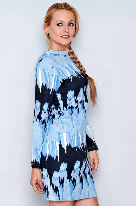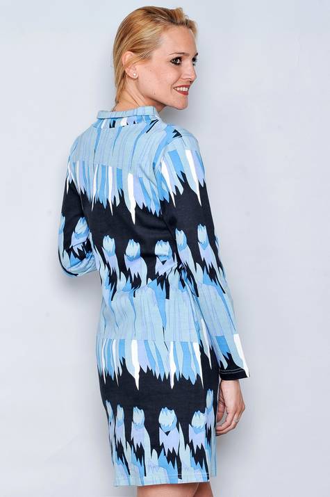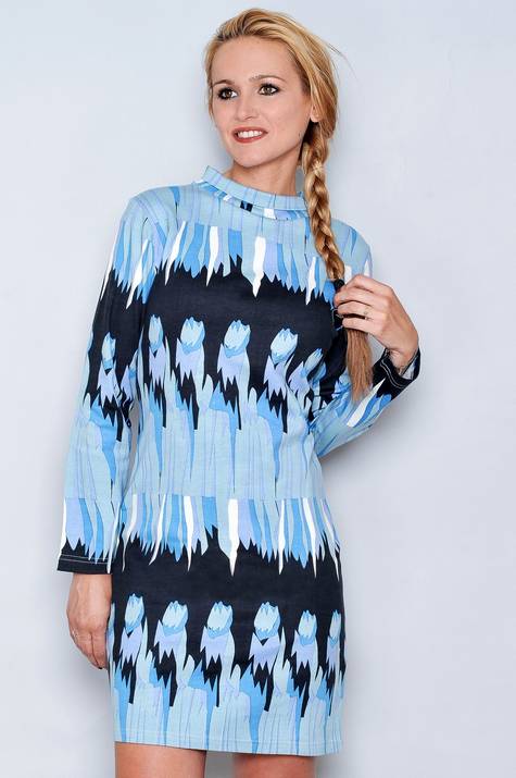 Vestido Manga Larga Cuello altoMotivos con flores, figuras en azul y negro