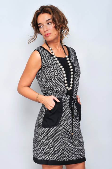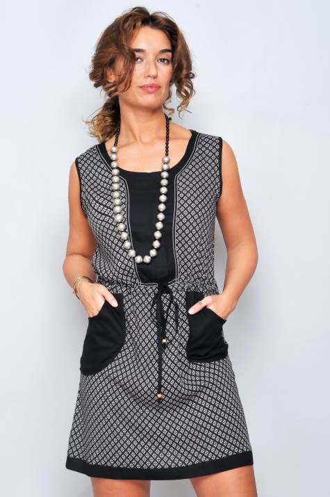 Vestido sin mangasSobre estampado gris y negro detalle en el pecho y bolsillos en lisoCintura ajustable